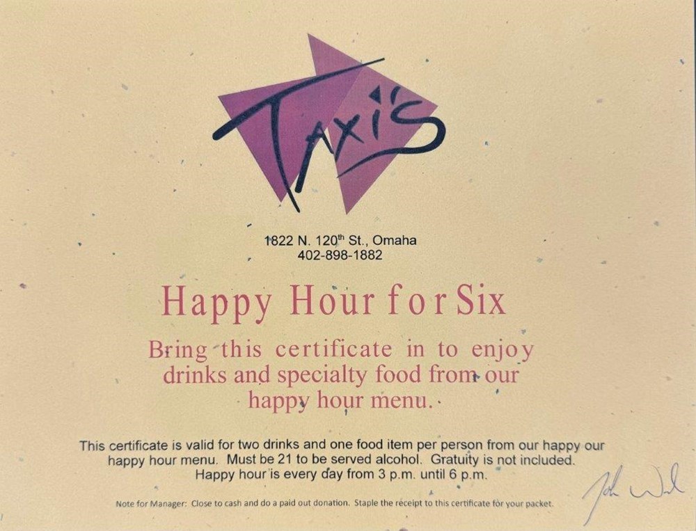 Looking for a fun dining experience with friends and family? Use this Gift Certificate to enjoy two drinks and one food item for each person, from the Taxi's Happy Hour Menu (Gratuity is not included). Happy Hour is every day from 3pm to 6pm.