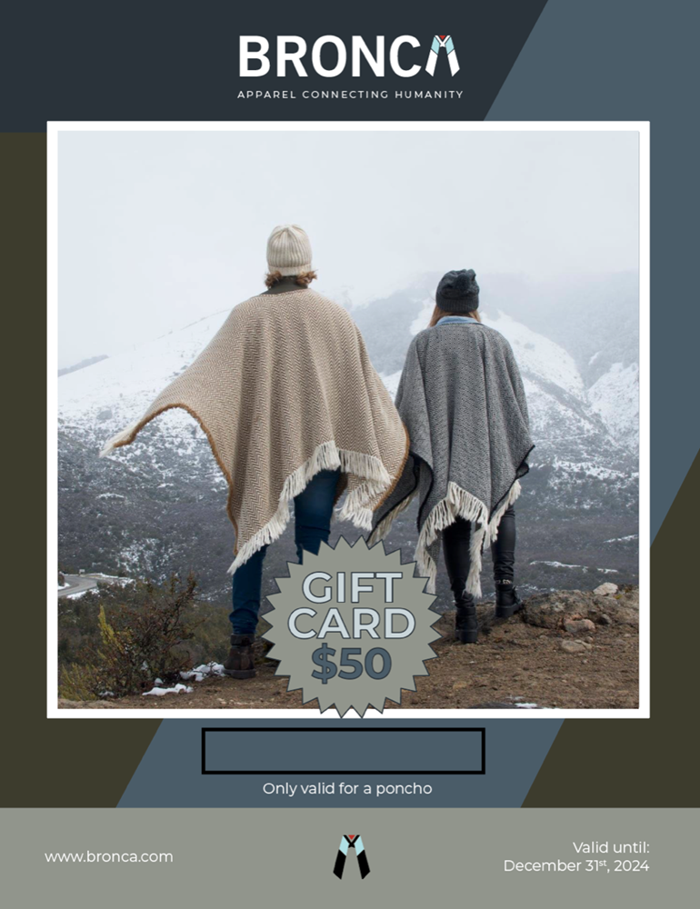 Use this $50 gift certificate to buy a poncho from Bronca! Fifty percent of Bronca's profits are donated to feed underprivileged children around the world.
