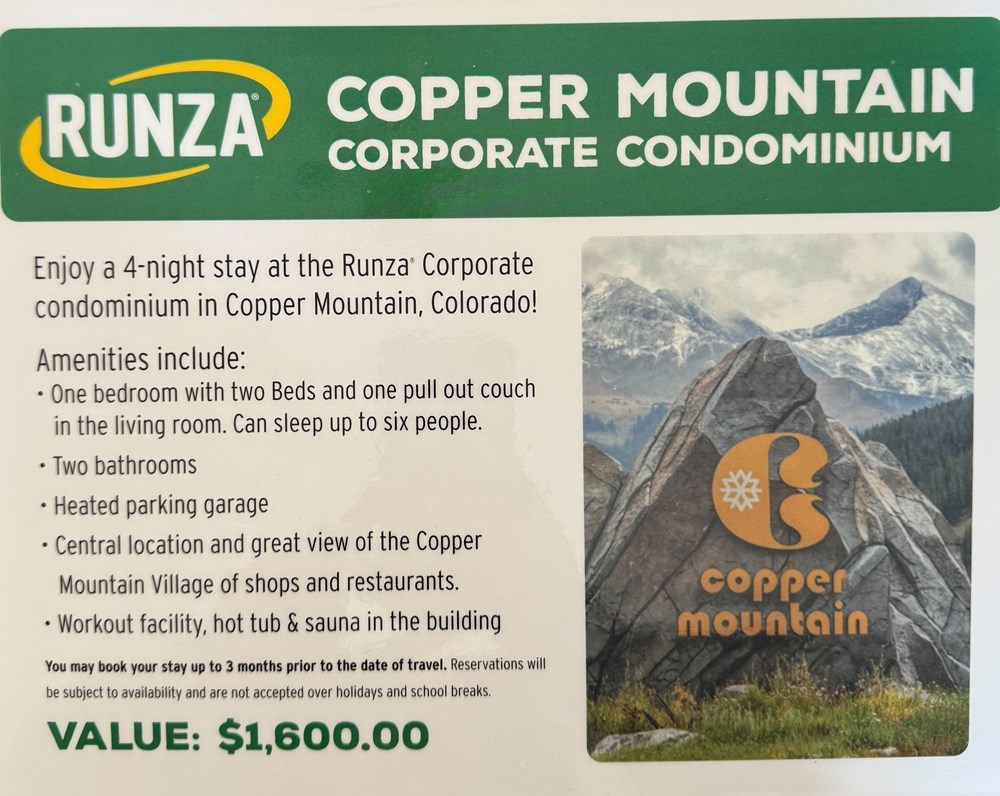 Enjoy a 4-night stay at the Runza Corporate condominium in Copper Mountain, Colorado! Amenities include: -One bedroom with two beds and one pullout couch -two bathrooms -heated parking garage -central location and great view of the Copper Mountain Village of shops and restaurants -workout facility, hot tub & sauna in the building You may book your stay up to 3 months prior to the date of travel. Reservations will be subject to availability and are not accepted over holidays and school breaks.