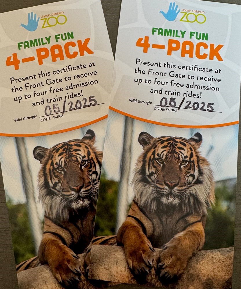 Looking for a fun day with the family? This package has 2 Vouchers admitting 4 people with train rides for each voucher to the Lincoln Children's Zoo and a $25 Runza gift card for afterwards!