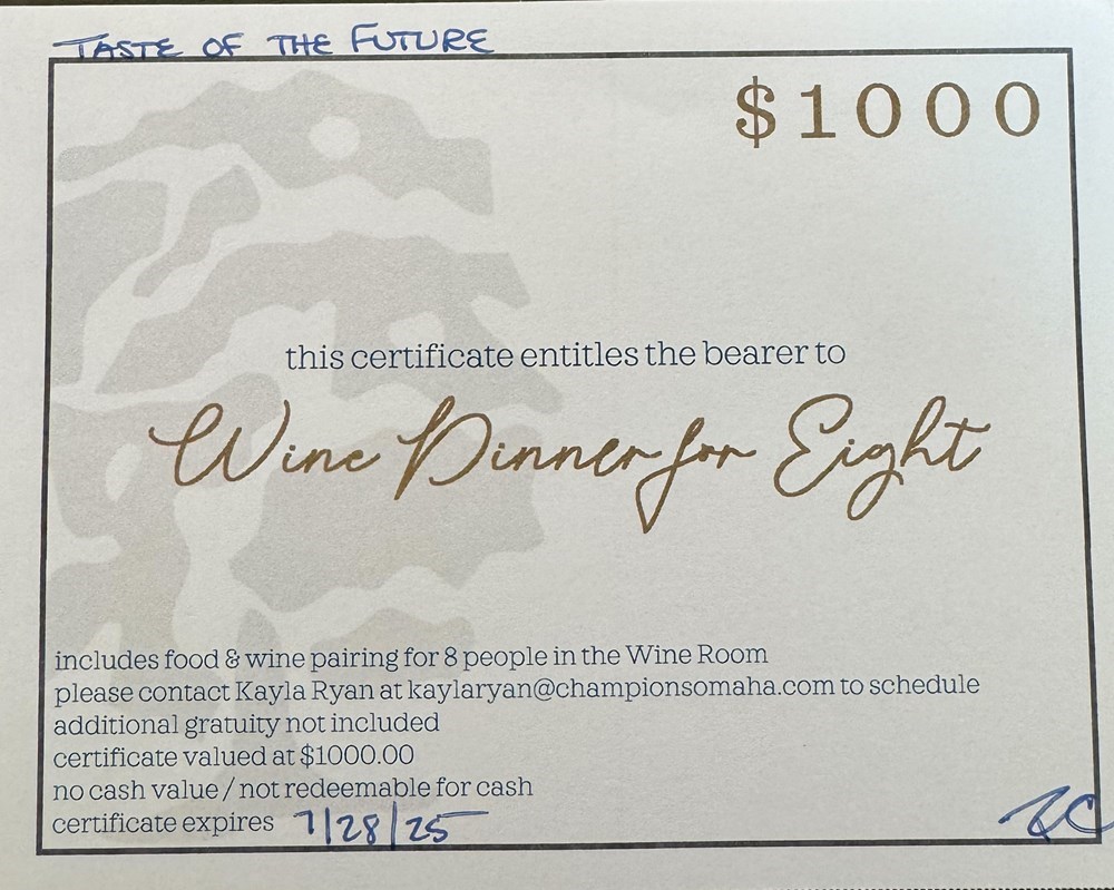 This certificate entitles the bearer to a wine dinner for 8 people to Champions Run. This includes a food and wine pairing for 8 people in the Wine Room.