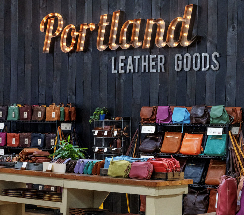 Collection of high-quality leather bags from locally-owned Portland Leather Goods including a beautiful leather shoulder bag, key fob, glasses case and small pouch.